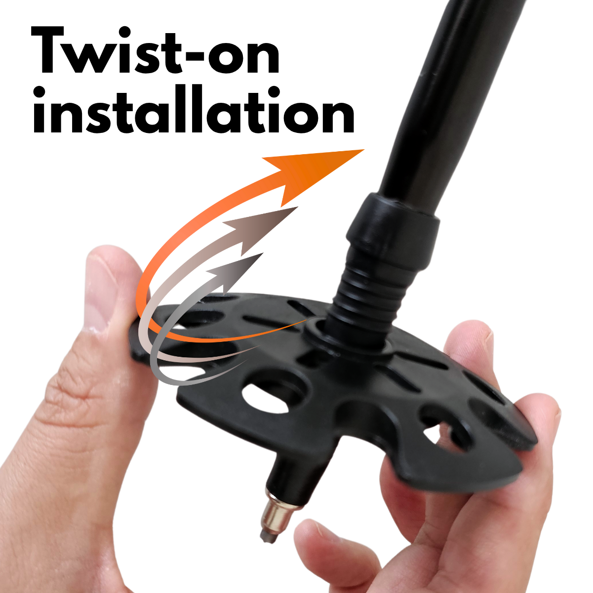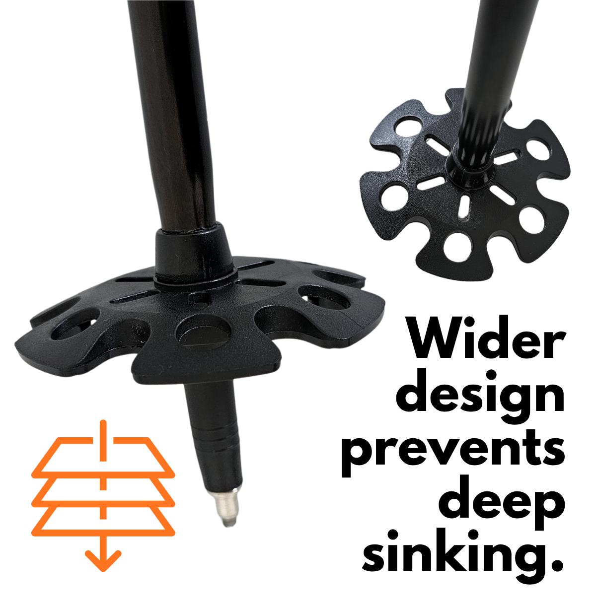Ideal for deep and loose terrains such as sand dunes, desert tracks, or soft snow. Simply screw them on clockwise along the threading about 7 cm from the pole tip to keep your poles steady and prevent them from sinking into the ground. Perfect for both beach hikes and winter trails.